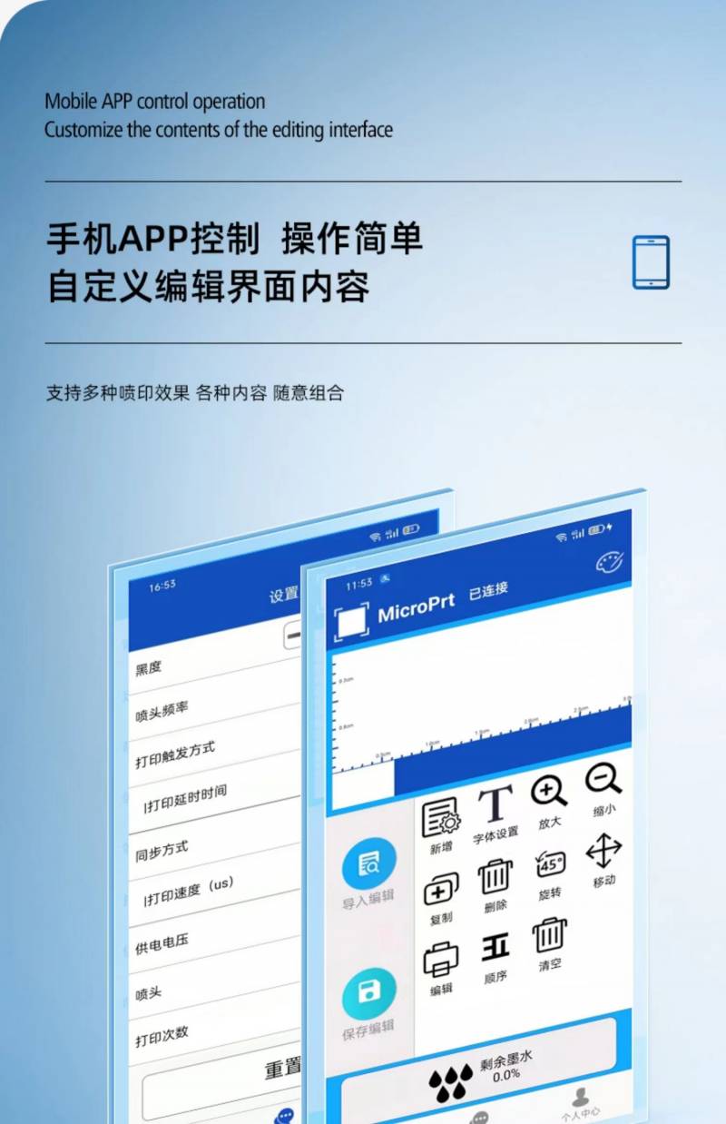 手機下載app智能操作,在線多功能噴碼機,可用于logo商標、中英文字體、生產日期、可變二維碼、一物一碼、條形碼等...