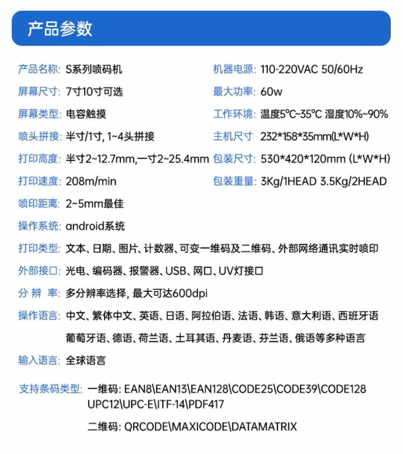 ![]() ![]() ![]() ![]() ![]() ![]() ![]() ![]() ![]() ![]() ![]() ![]() ![]() 高端在線工業噴碼機(12.7mm.單噴頭) 電容式觸屏,達到手機觸摸的體驗感,安卓系統.支持全球文字的噴印,且切換簡單,網絡云端升級,支持全球機器的定制,只需在本國聯網升級即可,操作簡單,功能強大,且支持外部實時數據噴印。 實時可變數據噴印,可變二維碼,條形碼,物品外包全自動賦碼,防偽,追溯碼,一物一碼。支持數據庫,外部Excel表格數據導入,自動生成二維碼,即輸即得,一掃便知,提高生產效率,節省標簽成本。 7寸電容屏,最快208米/分,九種組合 穩定高效,防擦防水,支持定制,數據可變,成本可控,計數變量,多噴頭無縫拼接,獨立噴碼。 |